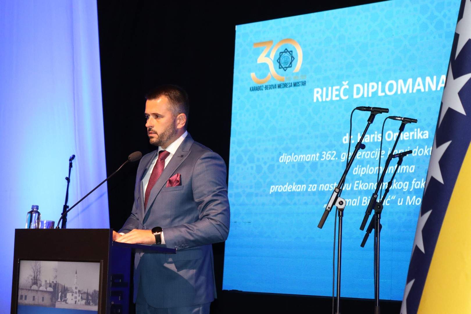 - Svaka odgojno-obrazovna ustanova ima svoju povijest i tradiciju, a tradicija i povijest Karađoz-begove medrese doista su posebne. Osnovana 1557. godine, ova ustanova je tijekom svog djelovanja iznjedrila mnoge poznate učenjake iz oblasti islamskih znanosti, filozofije, književnosti i mnogih drugih oblasti. Karađoz-begova medresa je odolijevala mnogobrojnim izazovima i obustavi rada čak 77 godina. Zahvaljujući ljudima koji su bili svjesni njenog značaja, vrata ove čuvene odgojno-obrazovne ustanove ponovo su otvorena 1995. godine. Zato im danas na obilježavanju 30. obljetnice reaktiviranja škole, iskazujemo posebnu zahvalnost, a ovaj kratki povijesni kontekst je podsjetnik na privilegiju koju naši učenici i uposlenici imaju, da budu dio povijesti Karađoz-begove medrese. Karađoz-begova medresa oduvijek je pružala kvalitetno obrazovanje, pružala je sintezu znanja, inkluzivnosti, otvorenosti i pristupačnosti i s posebnim poštovanjem se odnosimo prema njenom radu i djelovanju - kazao je ministar Velagić, dodavši da je opredjeljenje Ministarstva, da ulaže maksimalne napore da se djelovanje Karađoz-begove medrese u Mostaru podigne na veću razinu i da se osiguraju motivirajući uvjeti za još kvalitetnije obrazovanje.