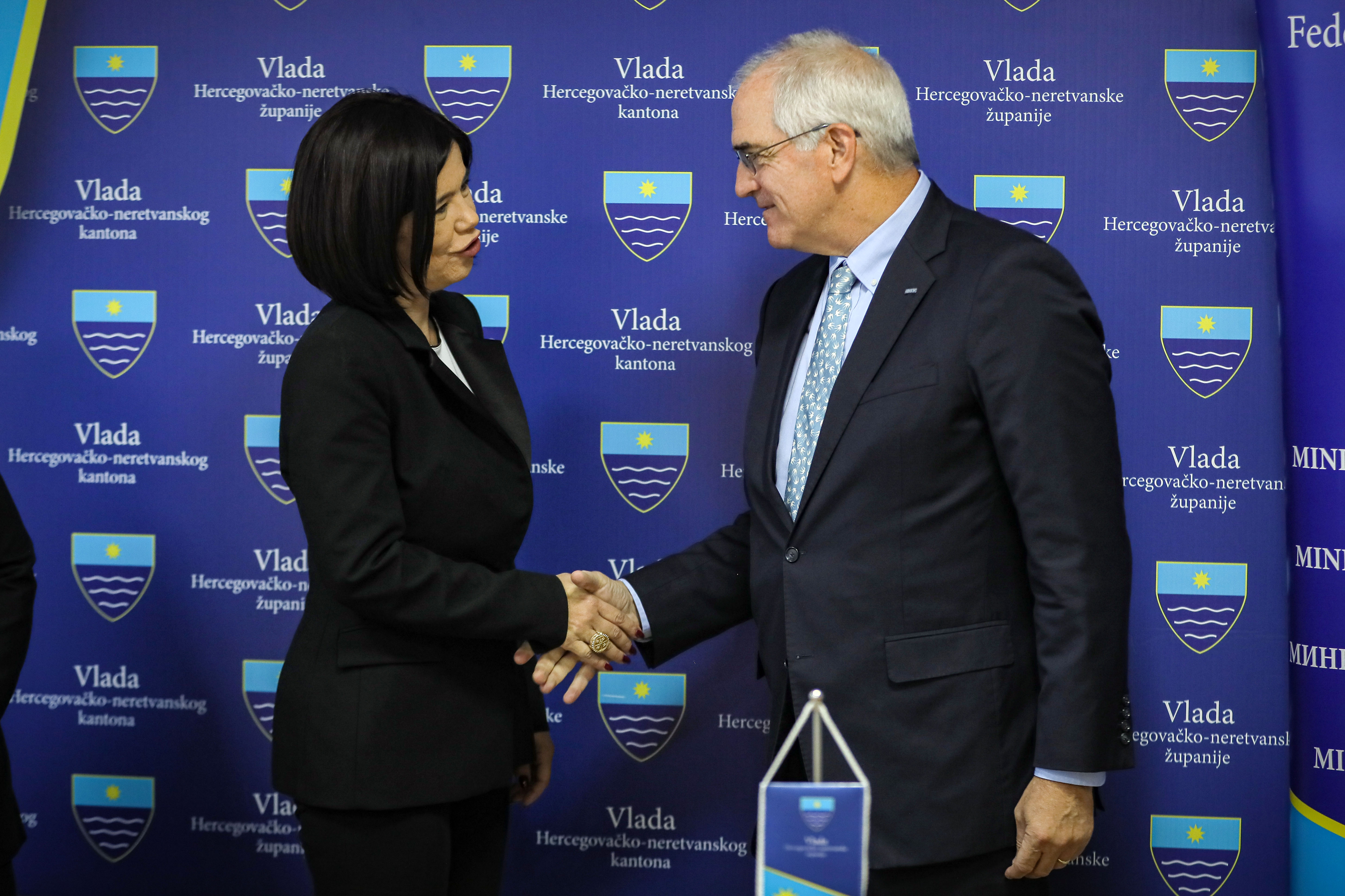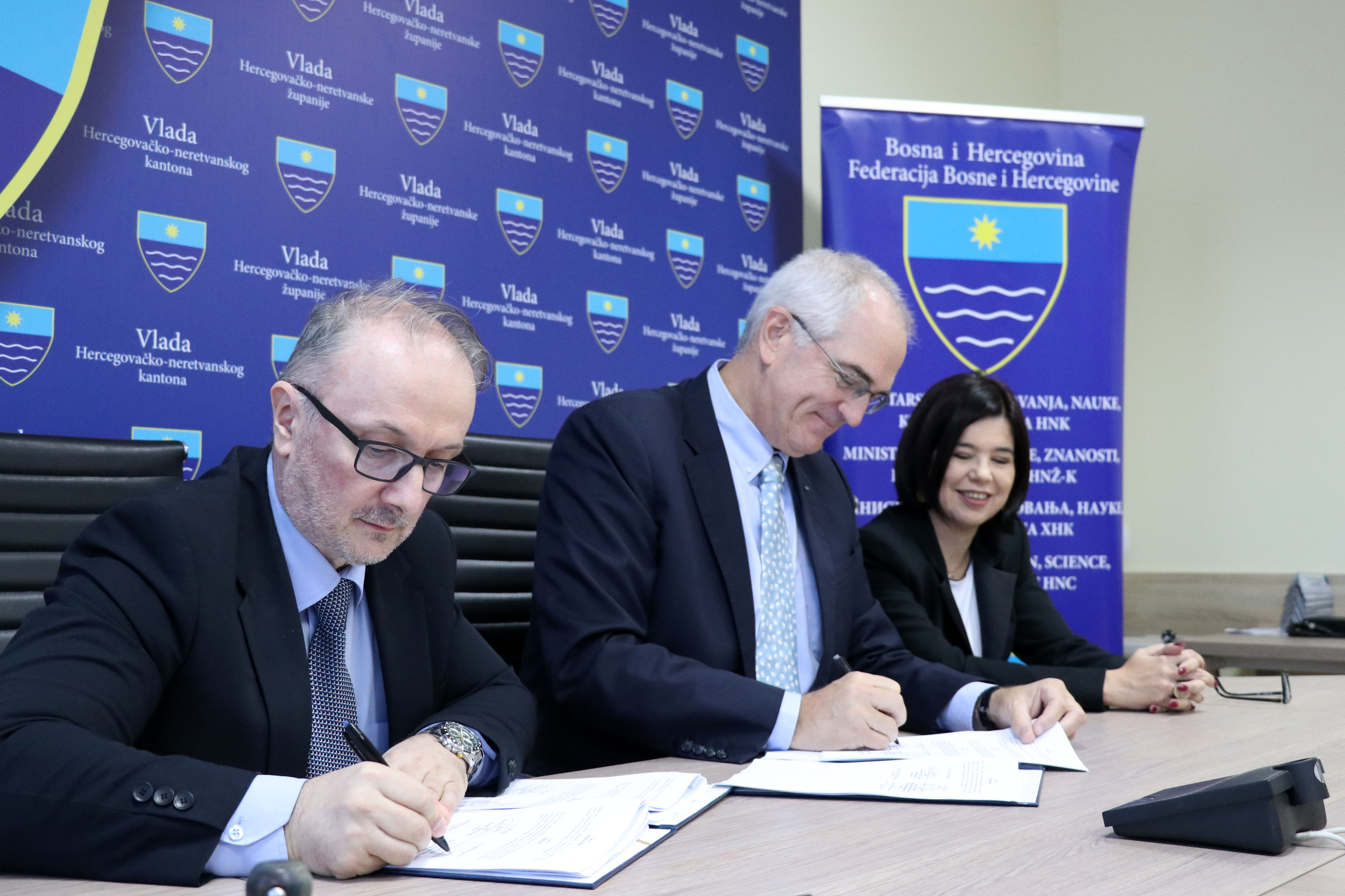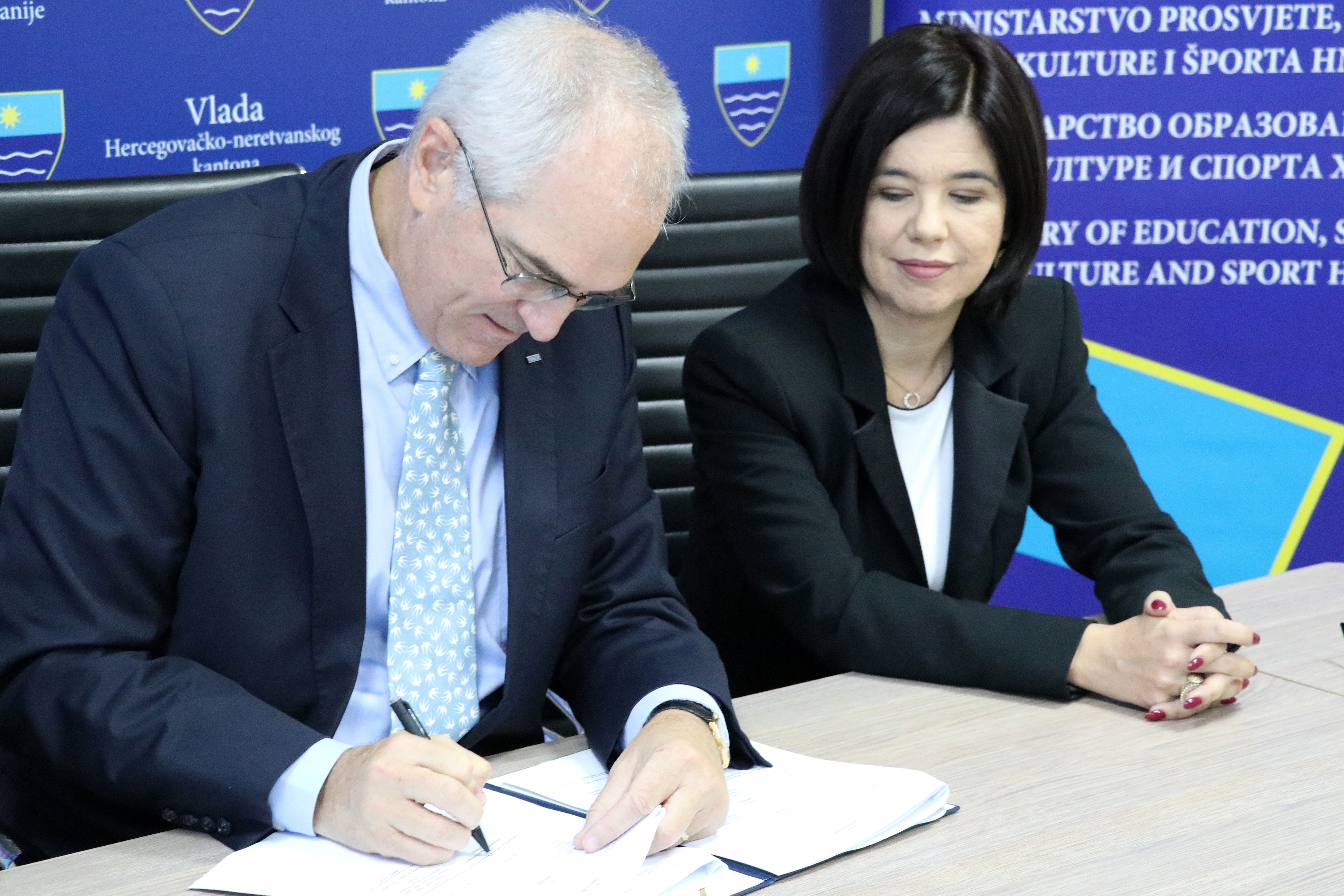 Ministar prosvjete, znanosti, kulture i športa Hercegovačko-neretvanske županije prof. dr. Adnan Velagić i novoimenovani voditelj Misije Organizacije za europsku sigurnost i suradnju (OESS) u BiH NJ.E. Rick Holtzapple danas su, u nazočnosti predsjednice Vlade Marije Buhač, potpisali Memorandum o razumijevanju kojim su potvrdili obostranu opredijeljenost i okvir za suradnju u procesu provedbe reforme nastavnoga plana i programa zasnovanoga na ishodima učenja u HNŽ-u.